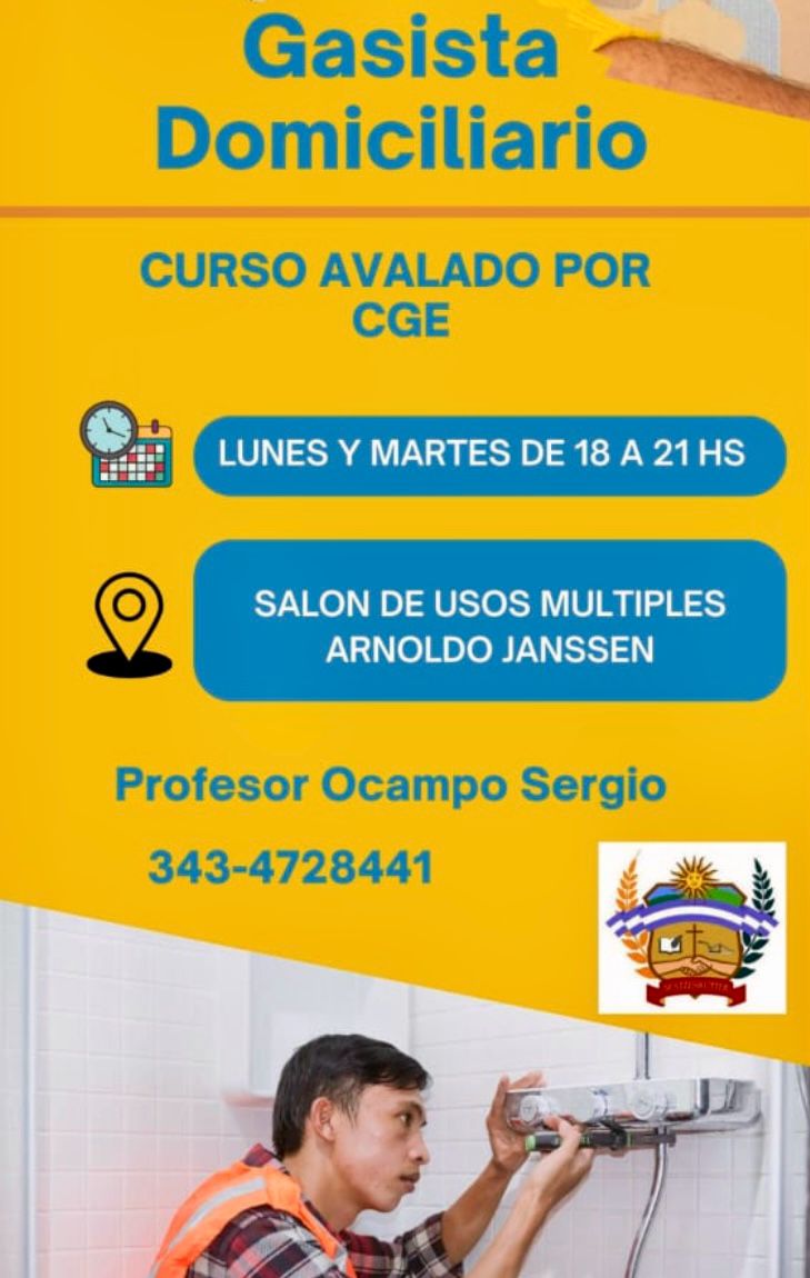 Una es la de ‘Gasista Matriculado’, siendo un curso avalado por el Consejo General de Educación. Se dictará los lunes y martes de 18.00 a 21.00 en el Salón de Usos Múltiples Arnoldo Janssen, estando a cargo del Profesor Sergio Ocampo. Para pedir más información o anotarse, comunicarse al teléfono 343 4728441.