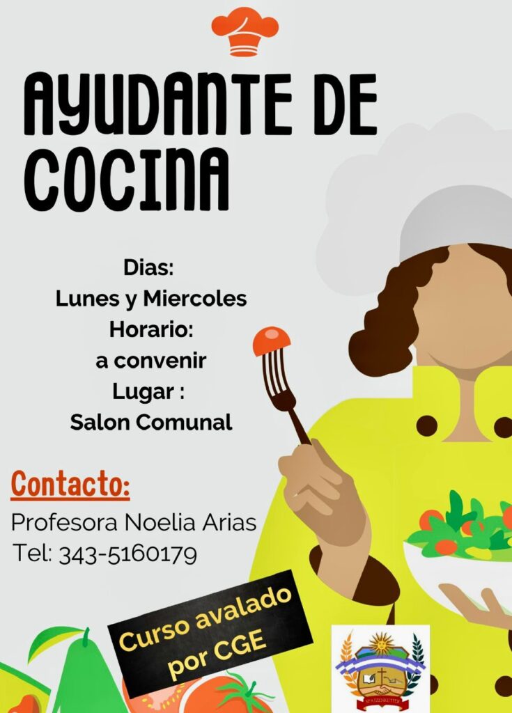 Otra es el de ‘Ayudante de Cocina’, curso también avalado por el CGE, que se dictará los lunes y miércoles en horario a convenir. Se dictará en el Salón Comunal, estando a cargo de Noelia Arias. Más información al 343 5160179.