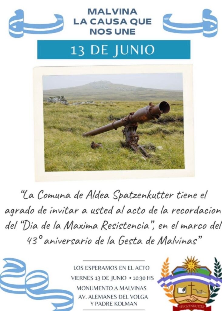 Mirando hacia adelante, te adelantamos que el 13 de junio a las 10.30 en el Monumento a Malvinas (Avenida Alemanes del Volga y Padre Kolman) se hará el acto de recordación del “Día de la Máxima Resistencia”, en el marco del 43° Aniversario de la Gesta de Malvinas.