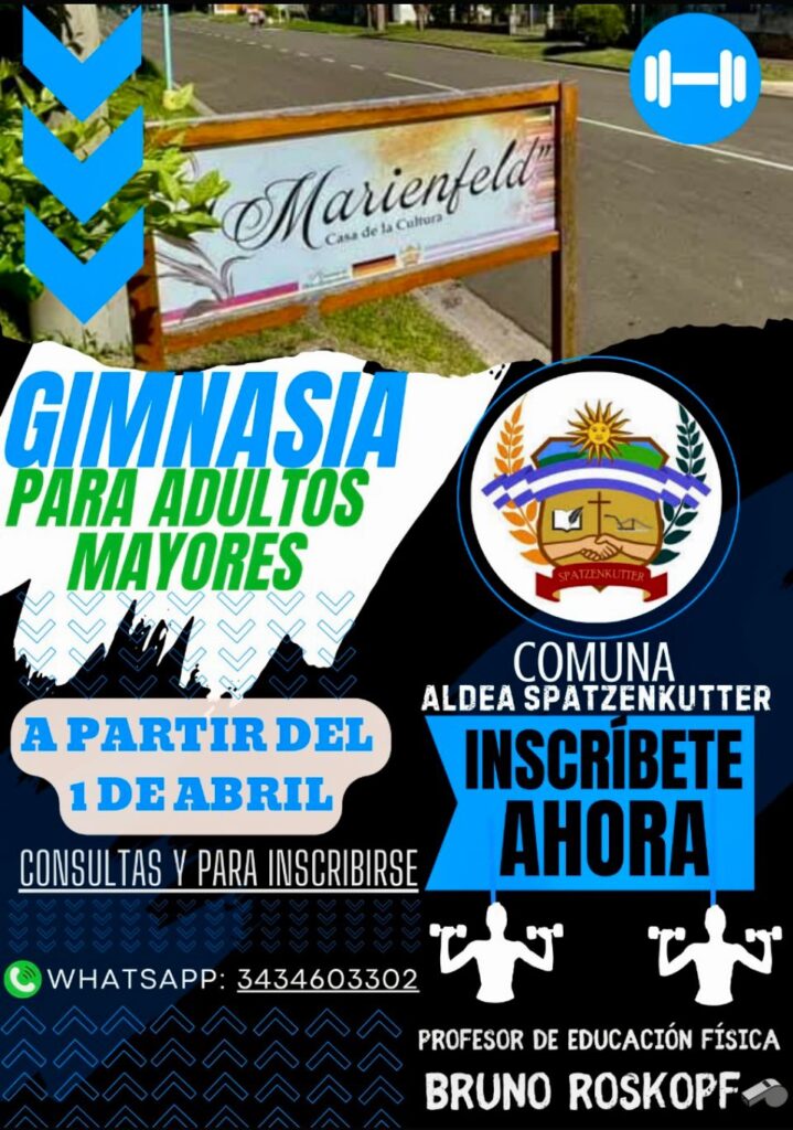 La invitación a sumarse se extiende a quienes quieran ser parte del Taller de Gimnasia para Adultos Mayores, que se iniciará el 1 de abril, en la Casa de la Cultura Marienfeld y a cargo del Prof. Bruno Roskopf. Interesados en inscribirse o pedir más información pueden comunicarse al celular 3434603302.